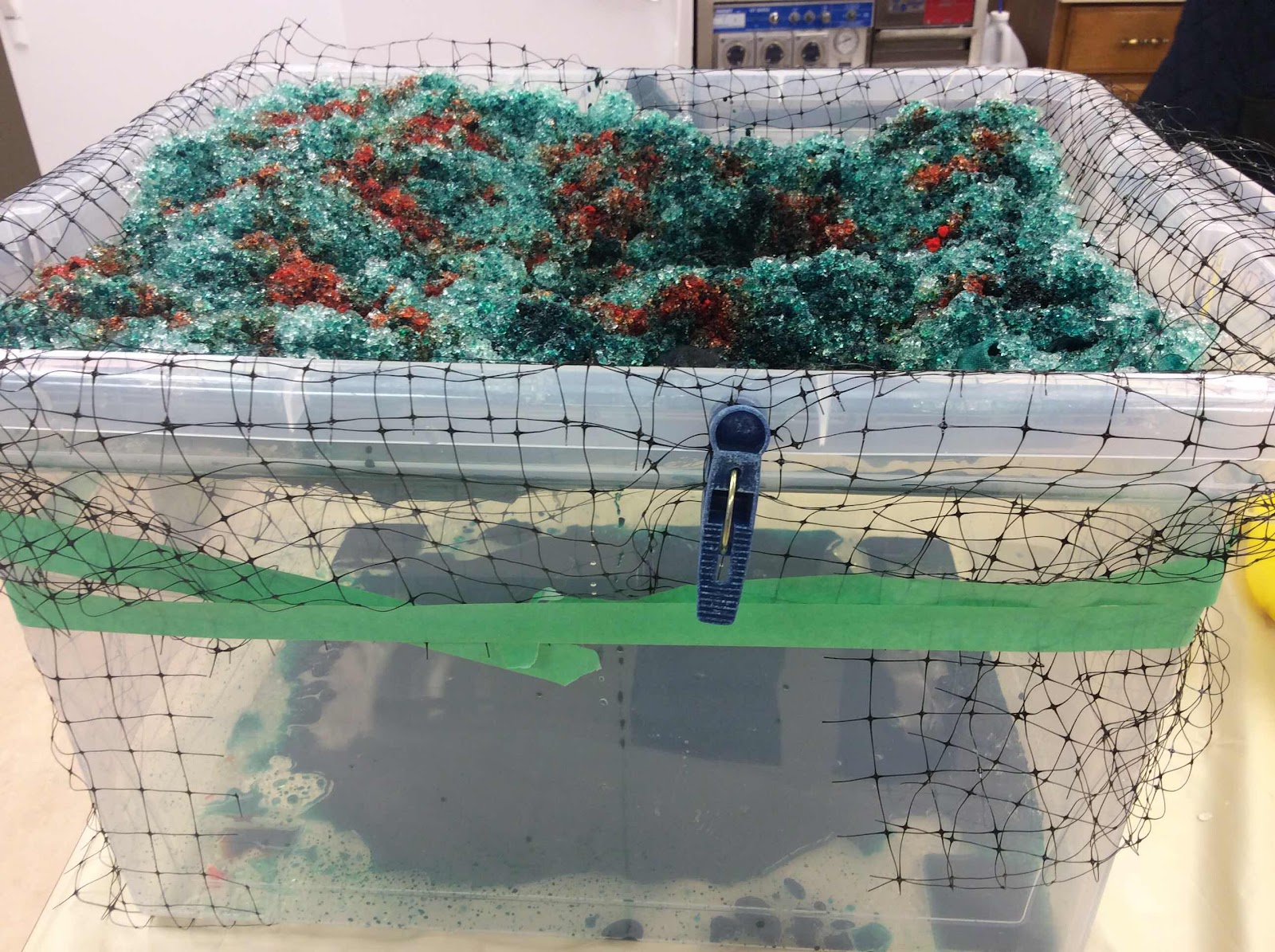 Soaked the fabric for 20 min in soda ash, layered on top of mesh, then a layer of snow.